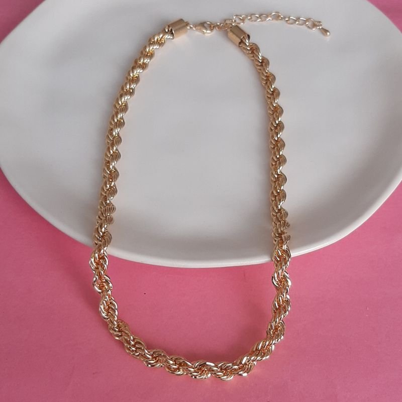 Também chamado colar baiano ,esse colar de corrente torcida é o queridinho da moda fashion . Use e abuse em suas composições . Faça composições com mistura de dourado e prateado . Fica lindo e super atual.