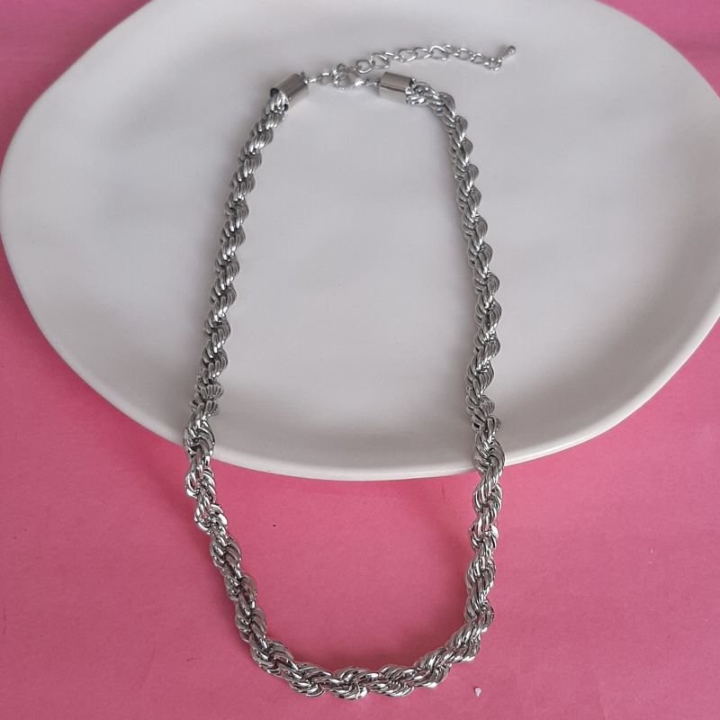 Também chamado colar baiano ,esse colar de corrente torcida é o queridinho da moda fashion . Use e abuse em suas composições . Faça composições com mistura de dourado e prateado . Fica lindo e super atual.