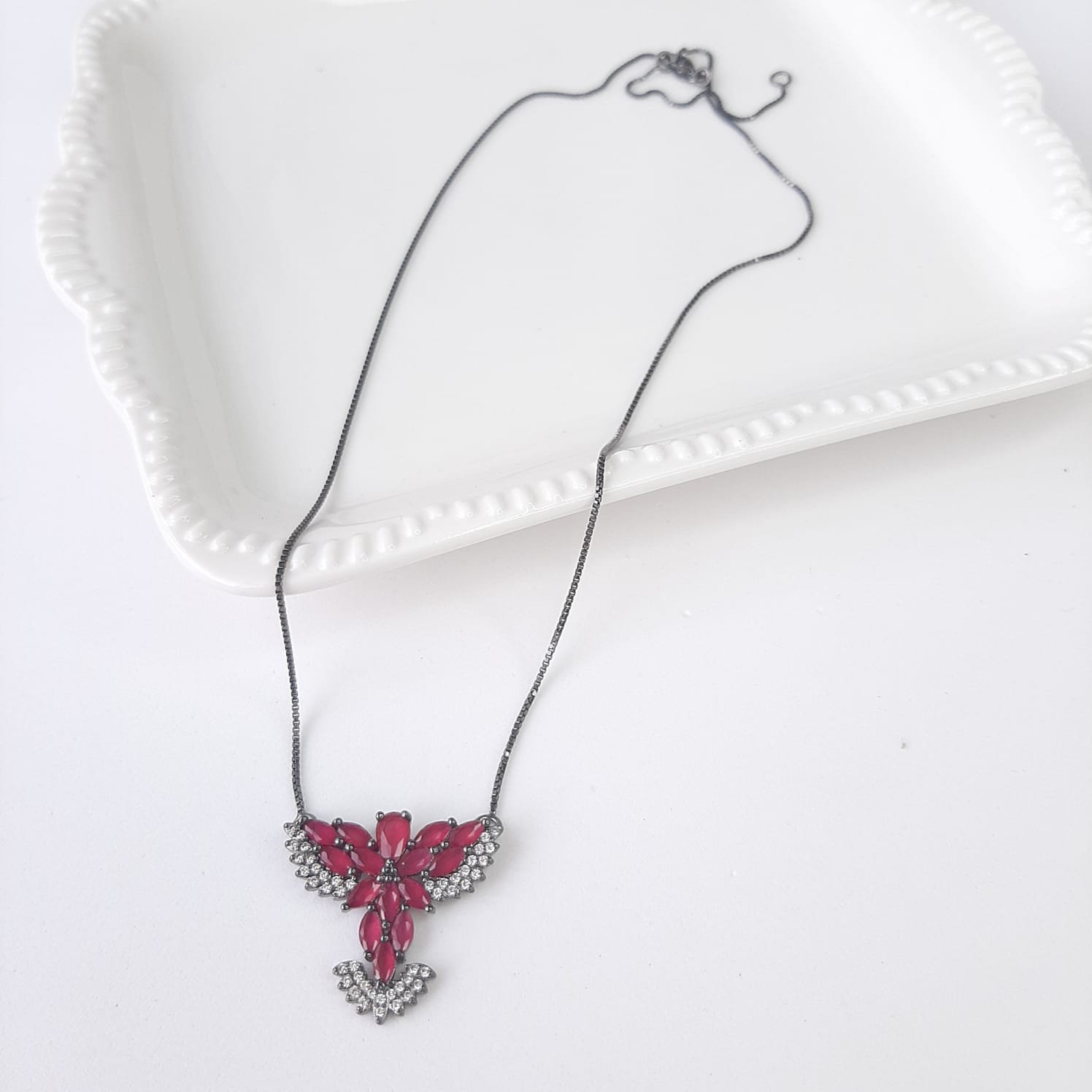 Colar folheado em ródio negro, com pingente todo desenhado de pedras formando Espírito Santo unindo as correntes, pingente é todo detalhado com pedras e microzircônias da cor cristal fazendo toda diferença e muito brilho para sua semijóia.