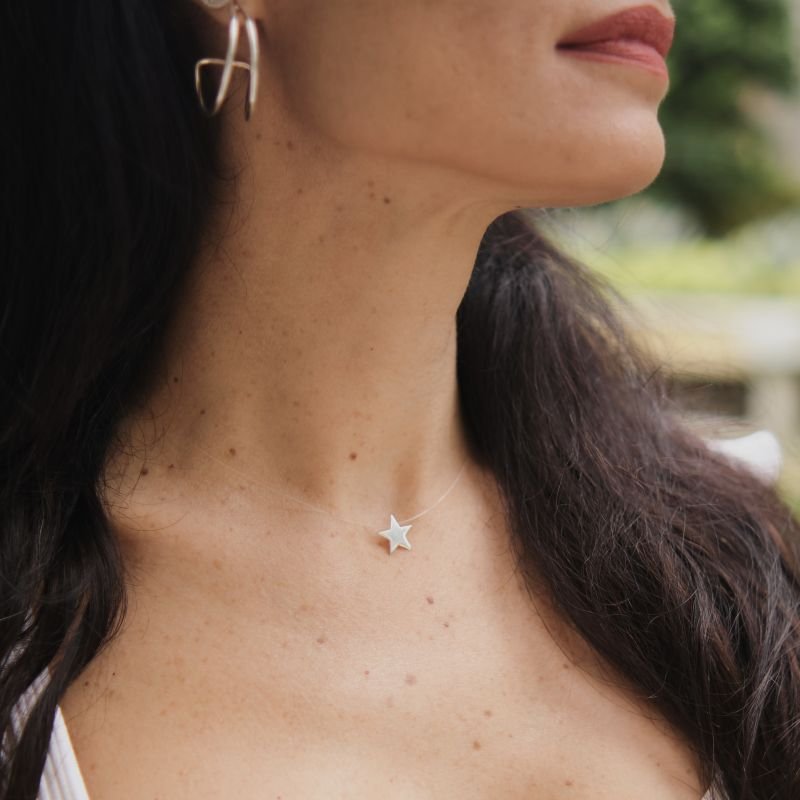 Colar Fio Com Pingente Estrela Em Prata e uma peça delicada e encantadora, esse colar traz um pingente de estrela em prata que parece flutuar sobre a pele graças ao fio de nylon transparente. ideal para quem ama acessorios discretos, mas cheios de charme. uma peça leve, versátil e perfeita para compor looks minimalistas ou dar um toque especial ao visual do dia dia.