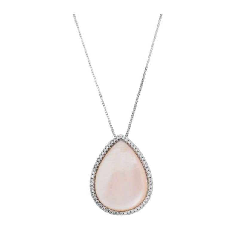 Um colar clássico com pingente em forma oval medindo 3 cm de altura e 2,5 cm de largura na parte maior . Portanto é um colar que marca presença com luxo. A madrepérola rosé e as zirconias no contorno realçam a beleza . A corrente é a veneziana , fina e maleável , no banho de rodio , mede 45 cm + 10 de extensor e tanto podem compor estilos de noite ou dia entretanto combina muito com estilos elegantes.