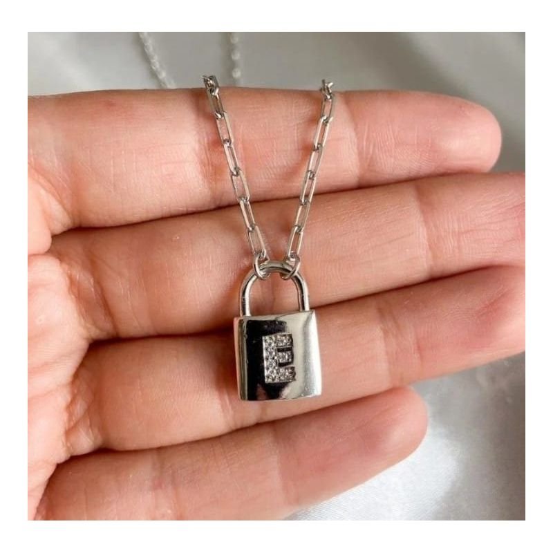 Colares com letra em modelo tradicional de cadeado com corrente de elos quadrados inspirado na joalheria . o Cadeado mede 1,5cm de altura e tem zirconias na cravação da letra . Atrás do cadeado tem a frase em ingles , "only love sets free" , traduzindo , só o amor liberta !