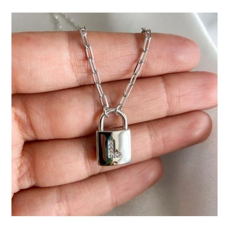 Colares com letra em modelo tradicional de cadeado com corrente de elos quadrados inspirado na joalheria . o Cadeado mede 1,5cm de altura e tem zirconias na cravação da letra . Atrás do cadeado tem a frase em ingles , "only love sets free" , traduzindo , só o amor liberta !