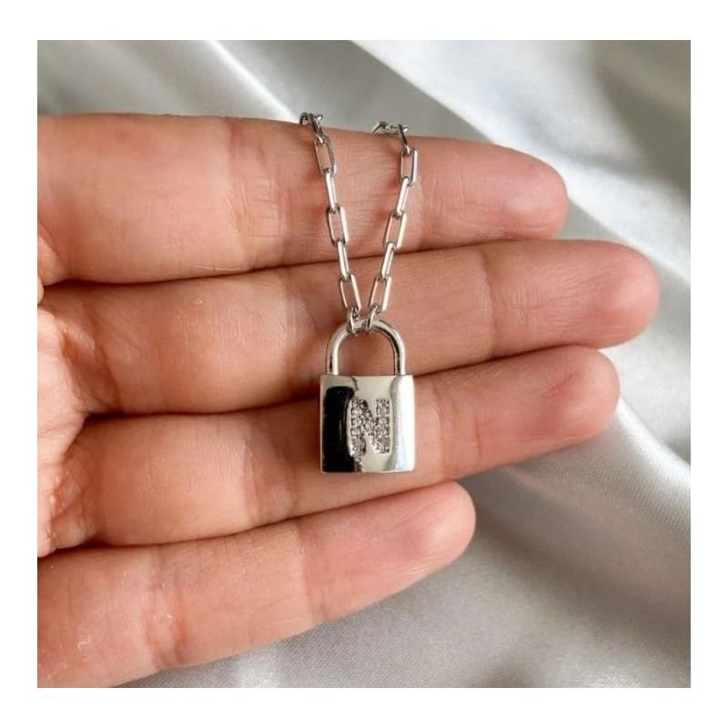 Colares com letra em modelo tradicional de cadeado com corrente de elos quadrados inspirado na joalheria . o Cadeado mede 1,5cm de altura e tem zirconias na cravação da letra . Atrás do cadeado tem a frase em ingles , "only love sets free" , traduzindo , só o amor liberta !