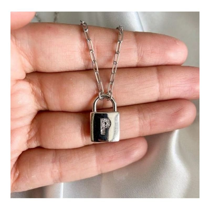 Colares com letra em modelo tradicional de cadeado com corrente de elos quadrados inspirado na joalheria . o Cadeado mede 1,5cm de altura e tem zirconias na cravação da letra . Atrás do cadeado tem a frase em ingles , "only love sets free" , traduzindo , só o amor liberta !