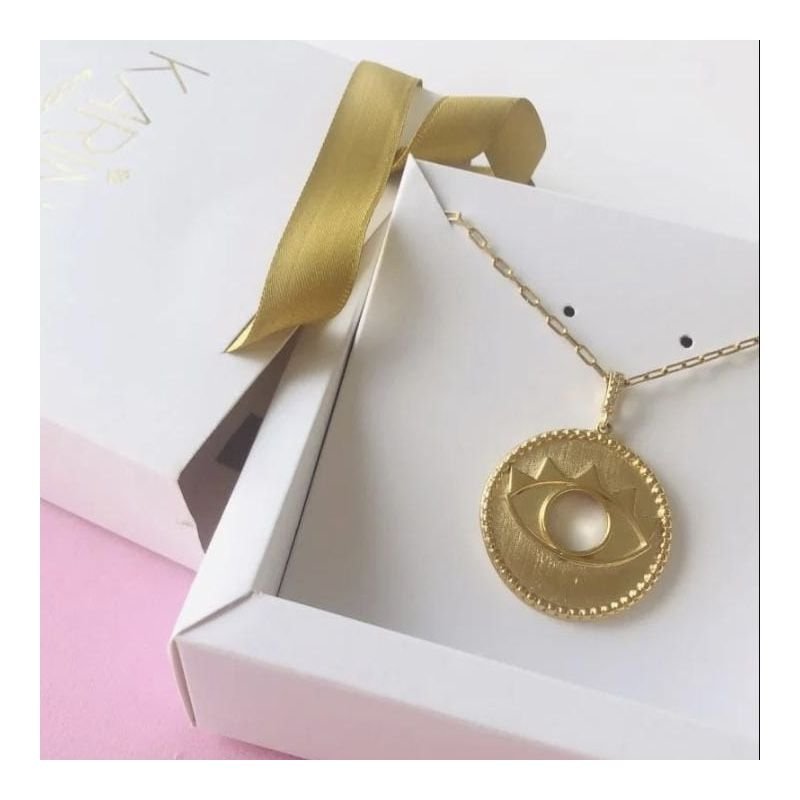 Que medalhão Lindo!!! Observe o visual do metal escovado e fosqueado com folheação ouro 18k como brilha! Além disso o detalhe da cravação da argola com microzirconias , um acabamento de semijoia luxo que você vai amar . O colar longo pode ser trocado por outra corrente se quiser variar. Pode ser usado como pingente em gargantilhas de aro ou outra corrente pois o elo permite correntes de outras expessuras. Aqui a corrente é tipo cartier, elos quadradinhos. , Perfeito e atemporal . Veja a versão rodio ( ouro branco ) Acho que vai querer os 2 . Dificil escolher