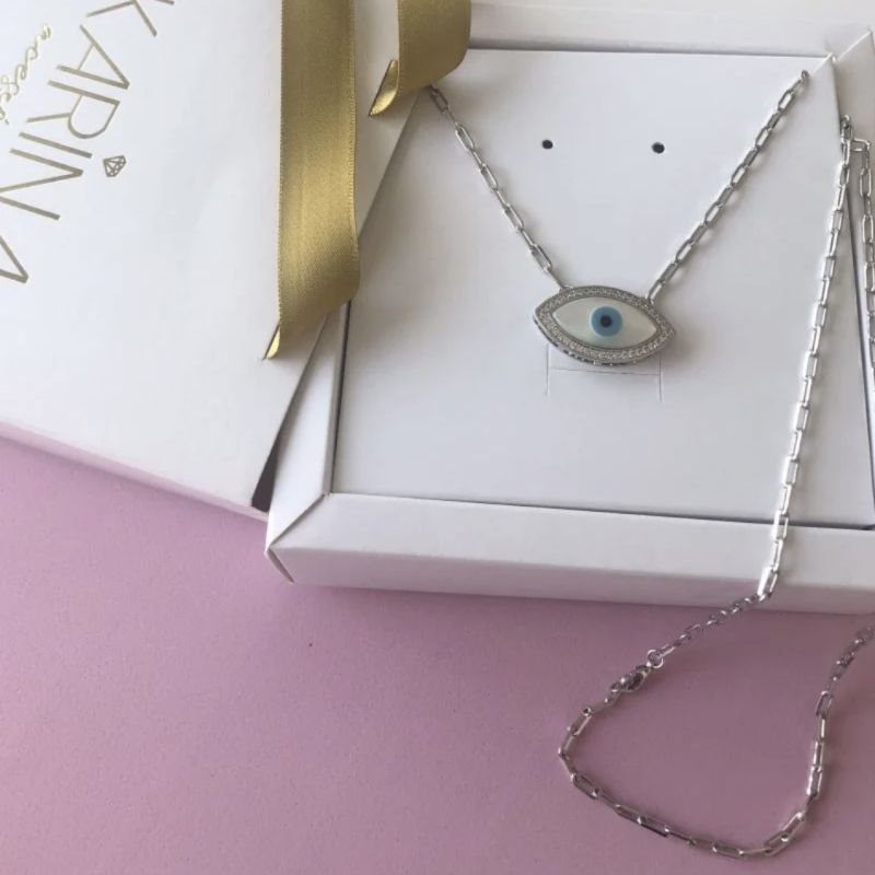 Lindo Colar Olho Grego Corrente Quadradinha Longo Folheado à Ródio de 70cm. O pingente é de madrepérola ao centro com cravação de zirconias ao redor do olho grego .