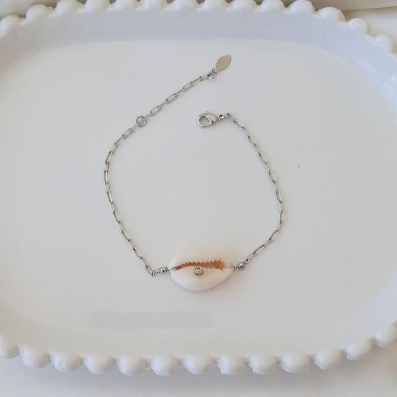 Pulseira com corrente de metal semijoia com concha buzio no centro . O buzio tem uma zirconia como detalhe . Essa pulseira mede 17 cm podendo chegar a 20 cm pois tem a corrente extensora . O fecho é tipo lagosta .