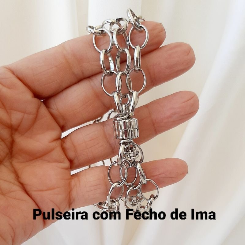 O segredo dessa pulseira é o fecho de ima. Para colocar basta aproximar as 2 extremidades .Fica linda , bem justinha no pulso mas não aperta . Mede 19 cm . super indicada para as meninas de pulso pequeno . São 3 correntes de elos